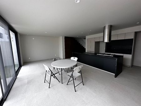 Planta baja : sala comedor, cocina integral, jardín, medio baño, cuarto de lavado, cochera para dos autos.
